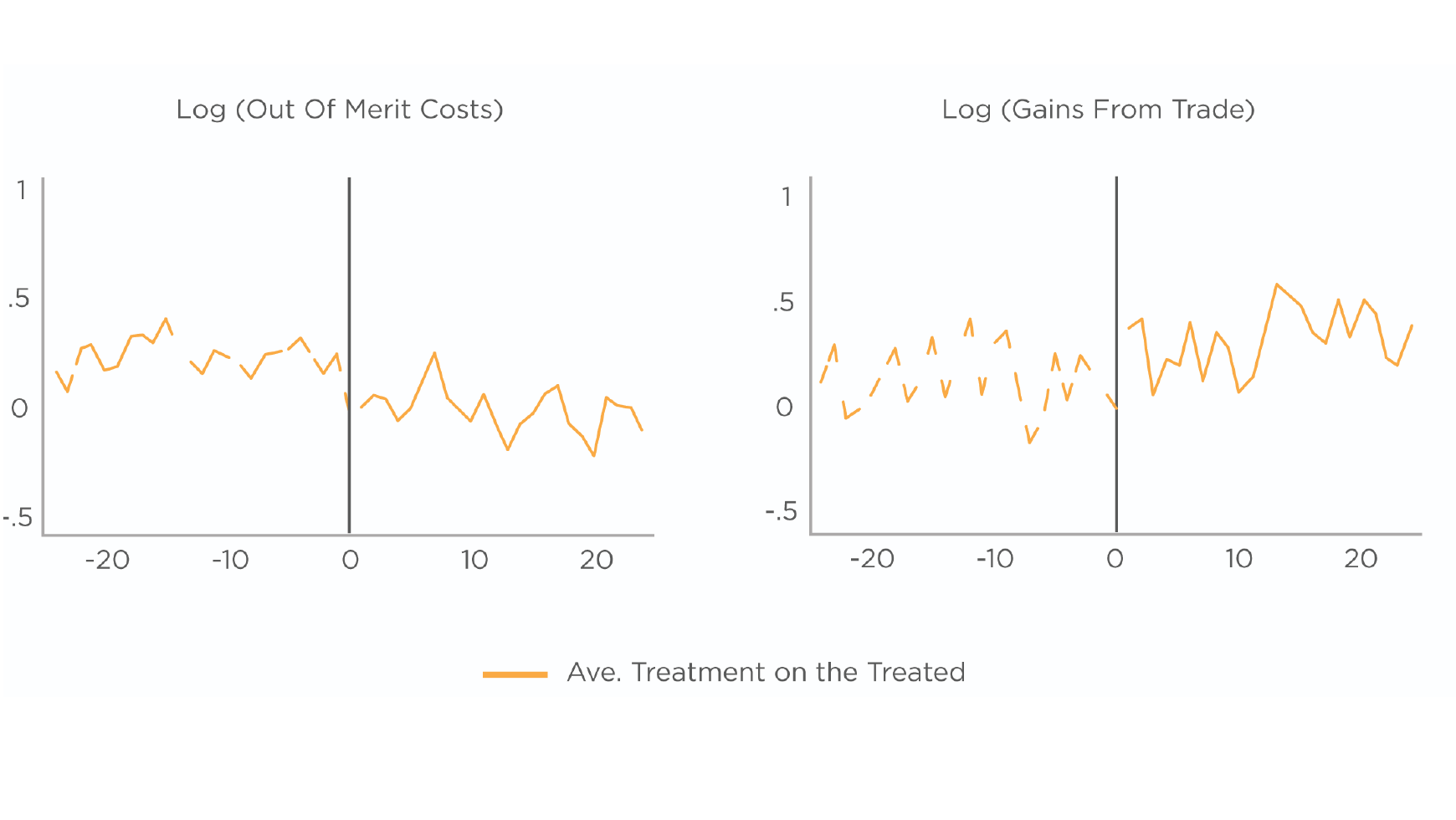 The study finds that power plant generators operating within markets are more likely to ensure their power plants are available to run when it is most economical. This means the lowest-cost plants are used 10 percent more often in market regions. This reduces “out of merit” costs—the costs incurred when the lowest-cost plant isn’t used—by nearly 20 percent. Further, power suppliers operating within markets are able to better identify low-cost generators across areas and better coordinate the dispatch of power, increasing trade by 10 percent. The savings from these transactions increases by 20 percent a year.