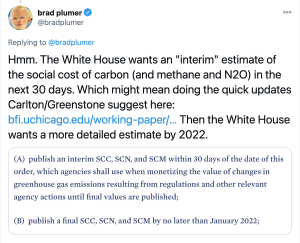 Updating the Social Cost of Carbon: EPIC Director Michael Greenstone and co-author Tamma Carleton outlined a two-step approach for updating the social cost of carbon (SCC), the total cost to society from each additional ton of CO2 emissions. First, they recommended that the Biden administration set an interim SCC that incorporates global damages, not just damages to the United States, and reduces the standard discount rate from 3 percent to 2 percent to account for profound changes in capital markets in recent decades. This would increase the SCC to $125 per ton – up from the Trump administration’s $1-$7 and even the $52 rate in the Obama administration. Second, they recommended that the White House form an interagency working group to carry out a comprehensive update to the SCC to bring it back to the frontier of climate science and economics. Senator Sheldon Whitehouse of Rhode Island tweeted a story about the SCC recommendations, calling the metric “a techie thing but it’s a BFD.” Days after their recommendations were released, President Biden signed an executive order calling for an interim SCC and the formation of an interagency working group. The interim SCC was later set at the Obama administration’s number (incorporating global damages but not changing the discount rate), while the more comprehensive review continues.