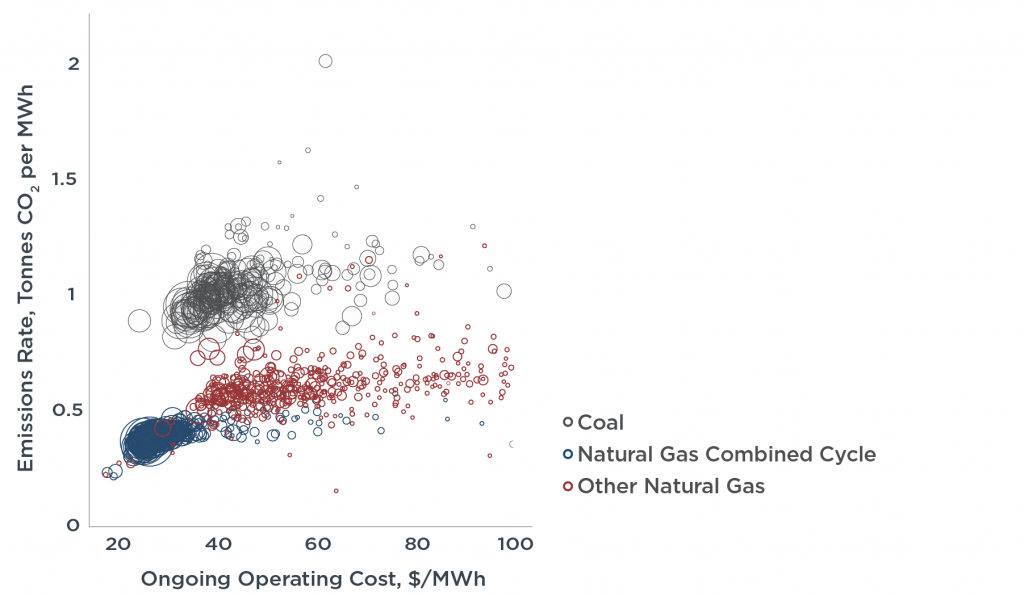 Distribution of U.S. Generators’ Ongoing Operating Costs vs. CO2 Emissions Rates, Gas Price of $2.89/mmBtu