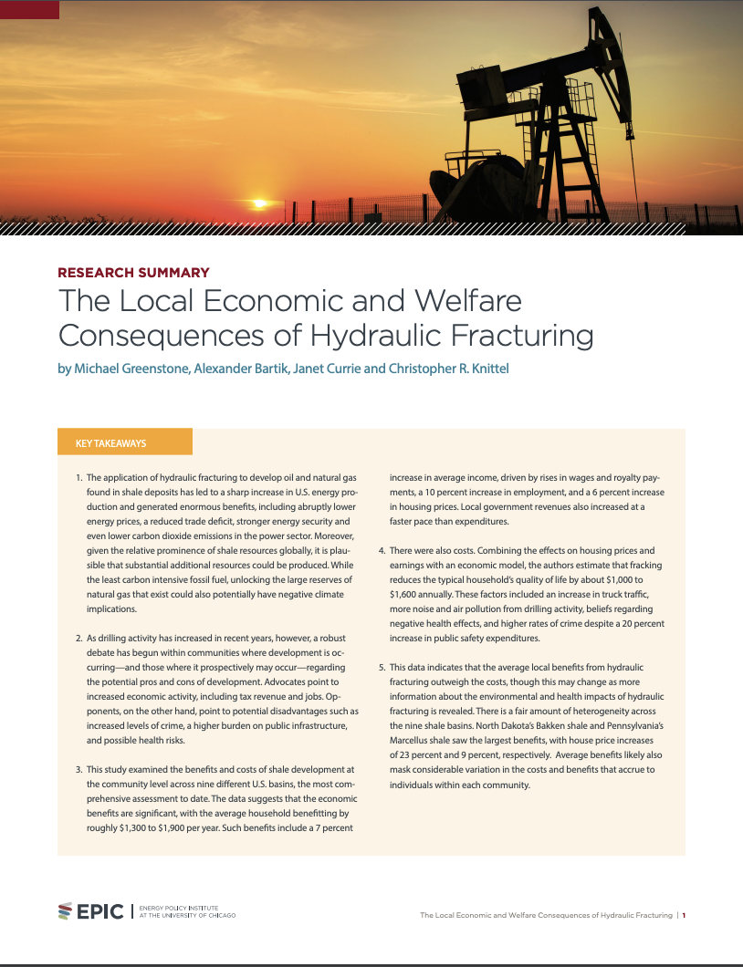 - The application of hydraulic fracturing to develop oil and natural gas found in shale deposits has led to a sharp increase in U.S. energy production and generated enormous benefits, including abruptly lower energy prices, a reduced trade deficit, stronger energy security and even lower carbon dioxide emissions in the power sector. Moreover, given the relative prominence of shale resources globally, it is plausible that substantial additional resources could be produced. While the least carbon intensive fossil fuel, unlocking the large reserves of natural gas that exist could also potentially have negative climate implications.