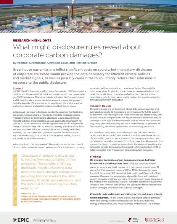 In 2022, the U.S. Securities and Exchange Commission (SEC) proposed a rule that would mandate that public companies report their greenhouse gas (GHG) emissions. This follows similar efforts in the European Union and United Kingdom, where regulations require companies to report both the impacts of their activities on people and the environment as well as how various sustainability elements affect the company. Widespread mandatory disclosure can be the sunshine that facilitates progress on climate change. Provided a mandate produces reliable measurements of GHG emissions, disclosure would allow financial markets to better price emissions, as well as provide a foundation for policies to restrict emissions. Mandating disclosure would also provide information on material risks to investors, making it evident which firms are most exposed to future climate policies. Additionally, emissions reporting has the potential to galvanize pressure from companies’ key stakeholders (e.g., customers and employees), leading firms to voluntarily reduce their emissions. What might such disclosure reveal? The study introduces the concept of “corporate carbon damages,” a measure of the total costs to society.