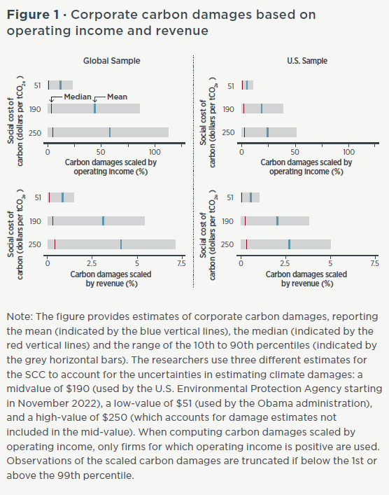 The analysis uses one of the largest global data sets on reported and estimated corporate GHG emissions, covering roughly 15,000 publicly traded firms. The vast majority of these emissions are estimated by S&P Trucost because companies do not report emissions. Moreover, a major challenge is that even for the companies that do report their emissions, they rarely provide third-party validation and there are no penalties for false reporting, underscoring the need for mandatory disclosure. For each firm, “corporate carbon damages” are calculated as the product of their Scope 1 CO2 equivalent emissions and the social cost of carbon (SCC)—the monetary value of the damages associated with the release of an additional ton of CO2. To account for differences in firm size and facilitate comparisons across firms, the authors then divide the (absolute) climate damages by the respective firm’s operating profit or sales to develop their measures of corporate carbon damages.