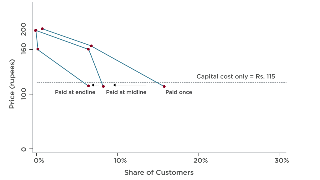The chart shows the share of sample households that paid for the solar microgrid at three different time intervals (represented by the three lines), and their demand for it at three different prices (represented by the dots).