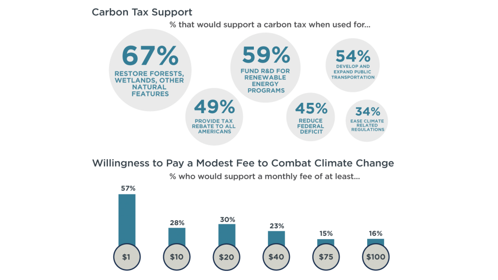 In EPIC’s annual public opinion poll with AP-NORC, 67 percent said they would support a carbon tax if the revenue went towards restoring the environment and 59 percent said they would support one if the funding went towards renewable energy R&D. These findings appear to run counter to the conventional wisdom about the most politically appealing version of a carbon tax and to recent efforts by the federal government to step back from environmental protection, with 49 percent and 45 percent, respectively, saying they would support a tax if they received a tax rebate or the revenue would reduce the deficit. At the same time, 43 percent are unwilling to pay anything out of their electricity bill to combat climate change.
